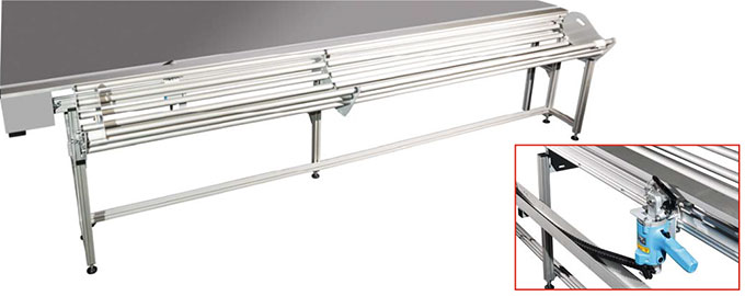 Diese neue Version.18 ist serienmäßig mit einer Kabelschleppeinrichtung ausgerüstet, so läuft das Kabel in einer Schleppkette unter der Schneideinrichtung in einem U-förmigen Kanal. Alles in eloxiertem Matt-Alu oder RAL 9006 beschichtet gefertigt. Dieser Endcutter hat keine lästige Kabelschwebeeinrichtung über dem Arbeitsplatz und schneidet alle textilen Materialien und Kunstfasern von 80g/qm bis 800g/qm. Mit der eingebauten Schleifeinrichtung schärfen Sie das Messer selbst – der große Durchmesser von 100 mm sorgt für extrem niedrige Schleifzyklen. Passend an vorhandene Zuschneidetische oder an unseren nebenstehenden.